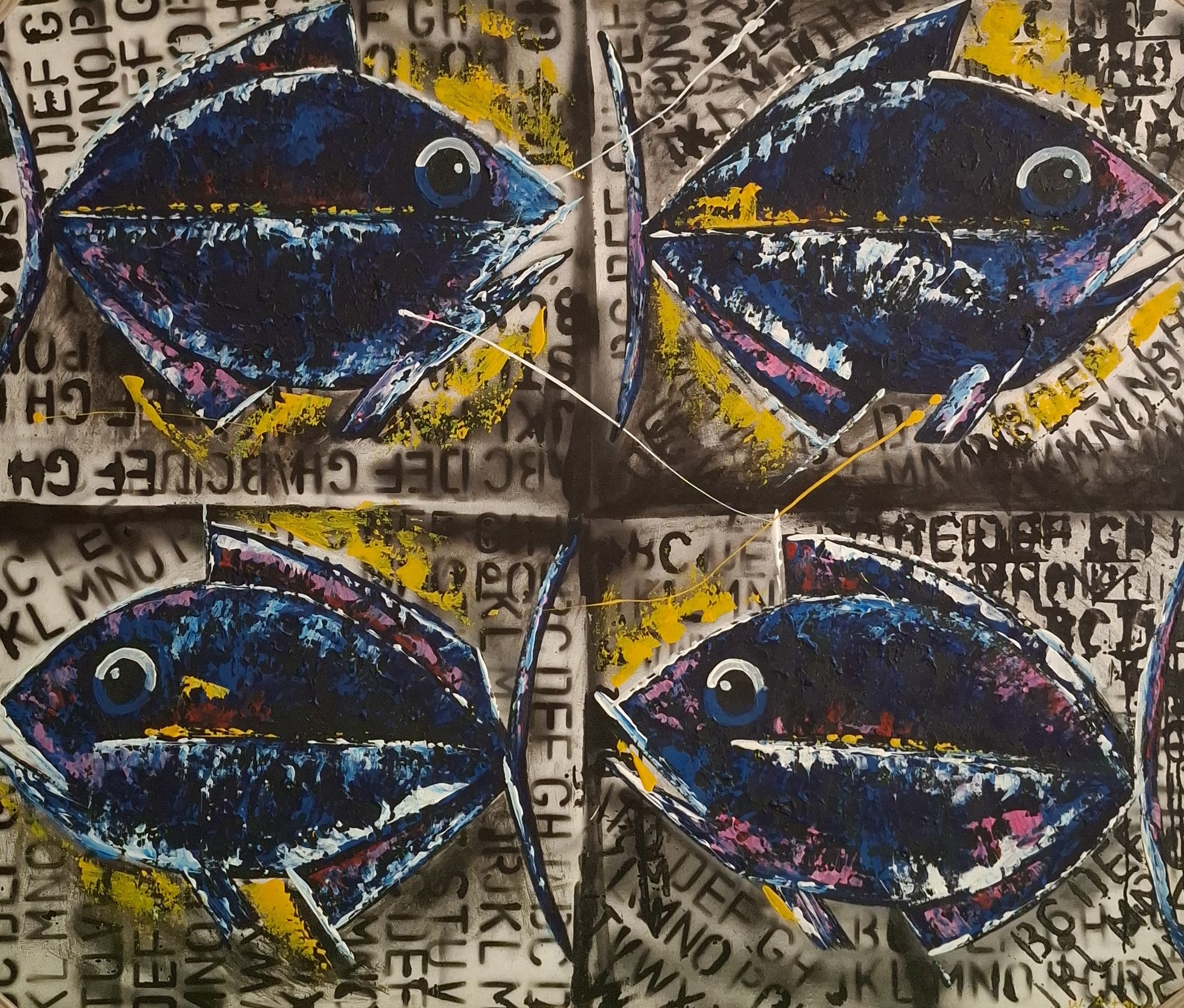 The artwork is arranged in a grid-like pattern, with four distinct quadrants, each containing a fish. The background features printed text and what appears to be yellow and black paint splatters, giving it a vibrant, urban feel.