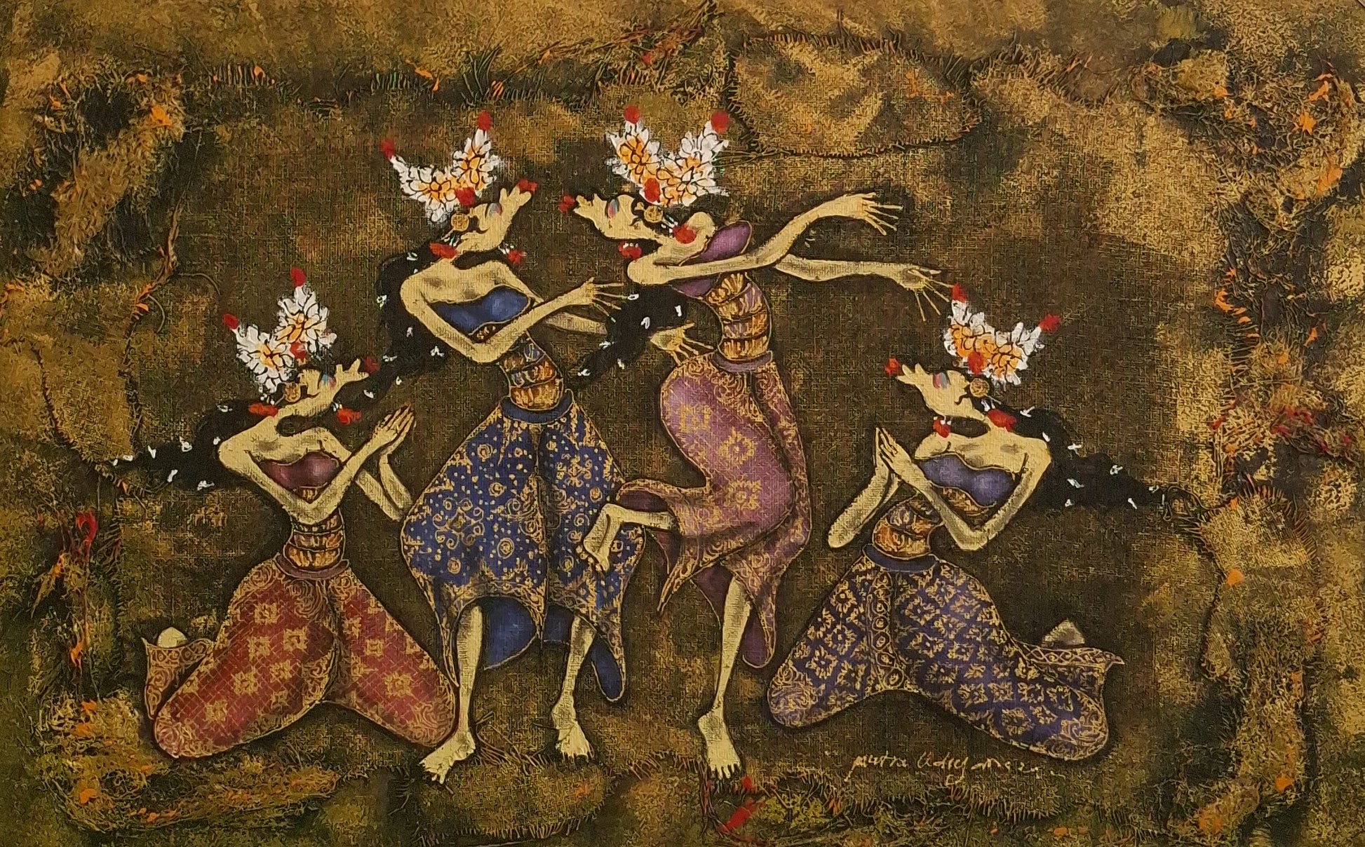 The painting portrays four female Balinese dancers wearing traditional headdresses and colorful batik-patterned sarongs. The style is reminiscent of the "Young Artist Style" of Balinese art, which emerged in the 1960s and is known for its vibrant colors, spontaneous approach, and a blend of folklore with contemporary life.